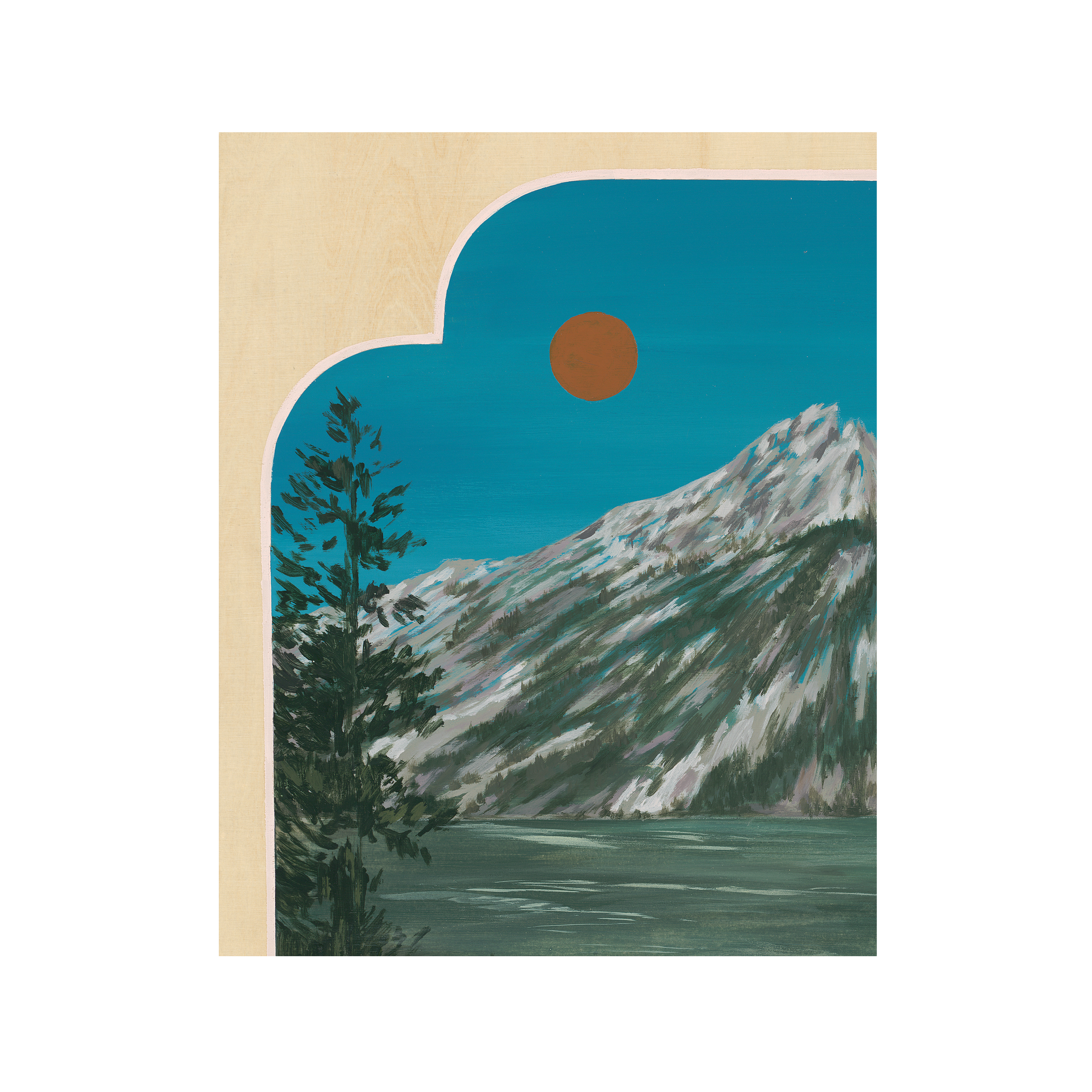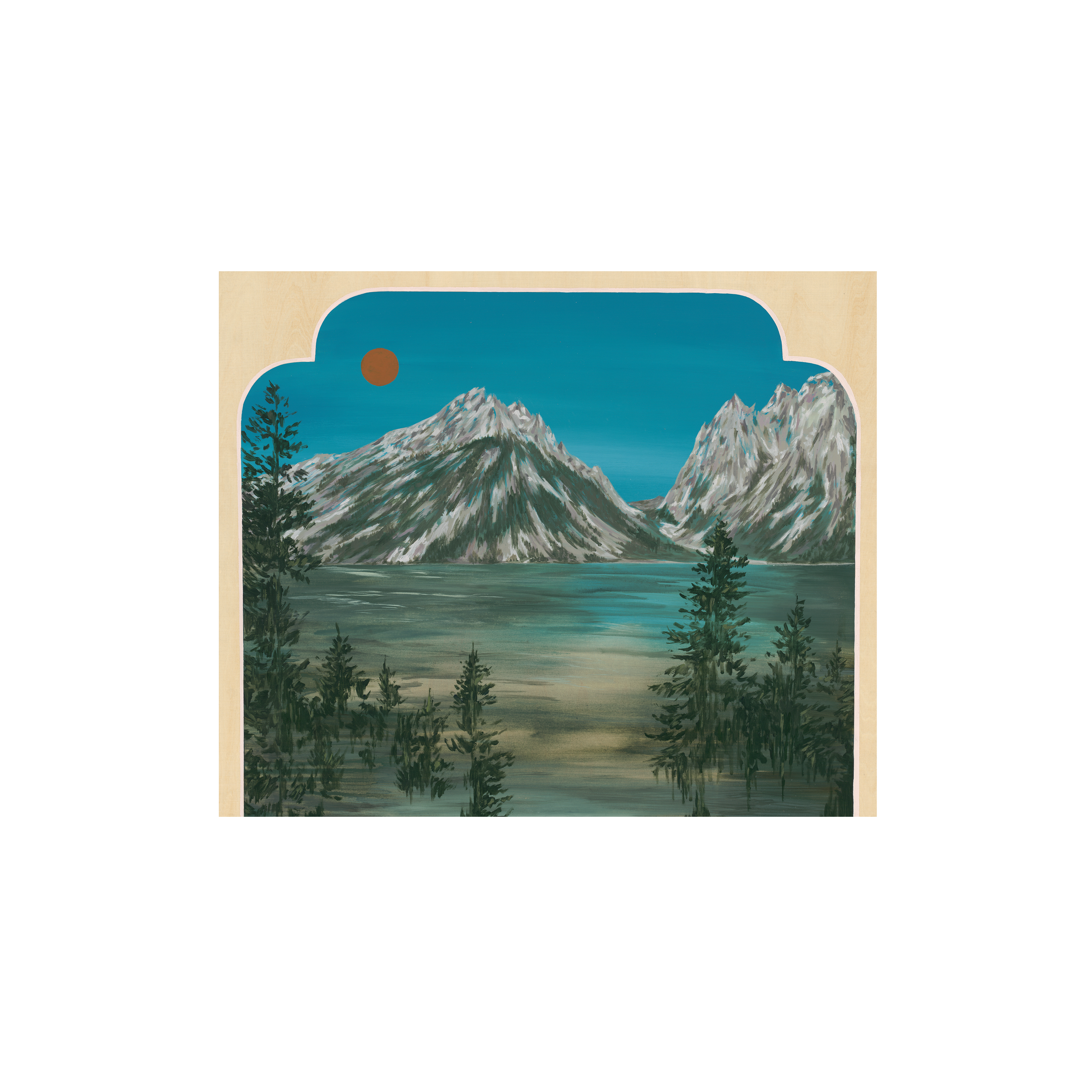 The painting depicts the lake’s shimmering surface, the grandeur of the mountains, and a cerulean sky. Wisps of atmospheric texture and soft architectural forms echo observatories or spiritual structures, drawing a line between grounded observation and celestial reverence. These forms do not impose - they listen. They are vessels of intention, presence, and prayer, offering a place of pause between the known and the imagined.